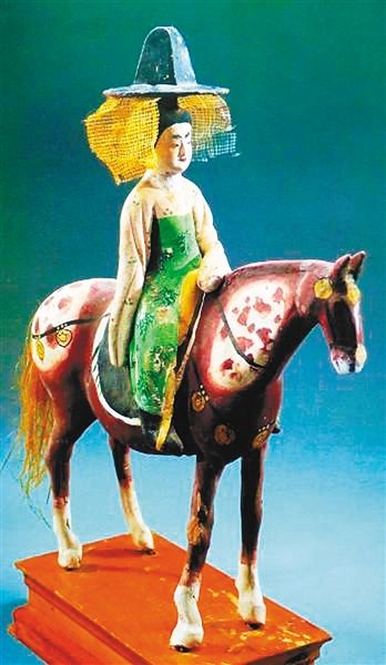 但細看這幅圖,所謂“羃”只是在寬檐帽下垂有帶狀物,不足以將全身遮蔽,很難說真的就是“羃”。因此關于“羃”的形制,還有待文物資料的繼續(xù)發(fā)現(xiàn)?!傲]”之外,“帷帽”的形制又是如何?從上面的介紹可知,帷帽的特點是“拖裙到頸,漸為淺露”。從這一點出發(fā),1972年新疆吐魯番唐墓出土的“彩繪騎馬仕女泥俑”,有人認為所戴就是帷帽。