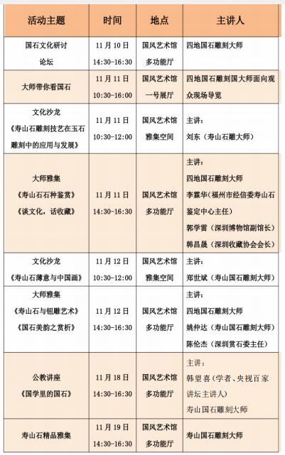 不僅如此,來自四地的國家級、省級工藝美術(shù)大師、非物質(zhì)文化遺產(chǎn)傳人將親臨深圳, 展覽期間,舉辦名家對話論壇,開設(shè)兩場名石雕刻藝術(shù)公開講座,另逢周末將特邀兩位國石大師在現(xiàn)場為觀眾導(dǎo)賞。