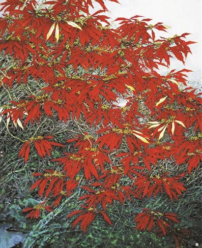 據閆國星介紹,這幅作品是他的老師給他布置的“命題作文”,為了完成作品,他特地坐飛機去西雙版納觀察野生一品紅,并在那里住了一個月,專門畫這個題材。因為題材新穎,傳統(tǒng)的筆墨無法表達其神韻,因此在畫法上,閆國星進行了大膽創(chuàng)新,在傳統(tǒng)畫法中融入現代畫法,最終這幅佳作才得以問世。