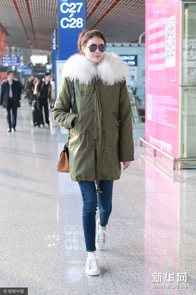何穗手插口袋御寒戴白色羽絨帽喜感足