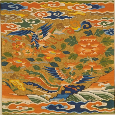 鸞鳳與牡丹、湖石、祥云相配稱“鳳穿牡丹”或“鳳戲(喜)牡丹”,佳節(jié)初歲時寓意四季平安、富貴吉祥。而成對出現(xiàn)的鳳凰與花卉又有贊頌夫婦恩愛、富貴白頭之意?,F(xiàn)藏美國大都會博物館的明人緙絲鳳穿牡丹方補原綴明代內(nèi)命婦吉服,穿用于慶典朝會。方補中一對緙絲彩鳳被安置在山花樹石佳景之中,叢生的靈芝、山茶、梅花、牡丹皆有吉祥寓意。這樣題材的緙絲補子亦見清華大學藝術館藏,可見在明代使用富有節(jié)慶特色的補子頗為常見。
