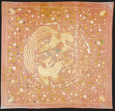 明清時期,羽翼華麗的鳳凰從遙遠的天上下降凡間,將一切美好灑向人間,這一時期織物上常見以纏枝花卉紋樣搭配鸞鳳、對鳳之裝飾手法,或配上菊花、蓮花、牡丹等人們喜聞樂見的四季平安花卉,鳳穿牡丹、鳳踏蓮花、龍鳳翔云等等吉祥紋樣以寫實手法細膩的表現(xiàn),無疑體現(xiàn)古人的思想和審美。