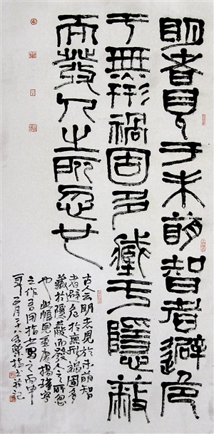 王和平以手指蘸墨,以手為筆,或疾或緩,不到十分鐘,一幅恰似石鑿雕刻力透紙背的書法作品躍然紙上,其變幻莫測的創(chuàng)作手法和獨特風(fēng)格令人叫絕。顯然,用手指畫的難度比用筆畫大得多。一般書寫一個字需要用手指蘸墨幾次以上,但又必須使字形整體合理自然,筆畫形式流暢靈動,不至于顯露手工痕跡,不至于給人以呆滯和工藝性強(qiáng)的感覺。要恰到好處地體現(xiàn)筆畫的緊湊、粗細(xì)、虛實、枯榮,是一件很不容易的事。功夫全在指頭,既非一日之功,也非人人可以練就。