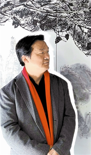 王和平說,指畫在美術(shù)大詞典里面能查得到的,起源于清初高其佩到高秉,再到“揚州八怪”一直到近代。而指書就更早了,明末傅山是寫指書的,但是指書沒有指畫傳承得好,寫指書比畫指畫難度大。王和平說:“我寫指書的目的是為了畫畫,指畫最大的弊病就是不能畫長線和塊面,所以我在指書方面學(xué)到的最大的經(jīng)驗就是畫長線。對于手指畫山水畫,原來的老先生畫山水都要用毛筆輔助上色的。我在研究的課題中,對我最有幫助的就是我畫指畫不再用毛筆上色,而是直接用手指、手背、手掌上色,而且上色比較均勻,最后畫面呈現(xiàn)的味道我覺得比毛筆上色的味道更濃、更有成像感?!?/p>