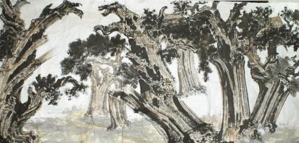 另一個(gè)他擅長的題材是古柏樹。1992年他去泰山采風(fēng)途中。山上的古柏樹生機(jī)勃發(fā),堅(jiān)韌不拔,給他帶來了一種震撼的力量。他當(dāng)時(shí)就想將這些古柏入畫,為古柏注入精神意義。從此,在孔府、孔林、古蜀道以及陜西等地都留下他觀察古柏的足跡。有評(píng)論家認(rèn)為,他的藝術(shù)作品不但在整體的構(gòu)圖上自然、清新和潤朗。而且在整體的布局上,疏密相間,虛實(shí)相融,用獨(dú)有藝術(shù)感覺構(gòu)建出了一個(gè)既蘊(yùn)含了詩情畫意,又張揚(yáng)了文化魅力和內(nèi)心情感的藝術(shù)空間。