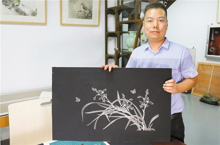 采訪現(xiàn)場,何俊剛向記者展示麥金畫的制作過程。首先是選麥,然后擇優(yōu)挑選,接著刨開、刮平、燙制、分料等,一片片金黃色的麥秸皮就完成了,裝箱備用。隨后,粘貼、書寫、刻制、上色、裝裱再壓光、裝鏡。何俊剛表示,刻制時(shí)既要精神集中,全神貫注,又要心平氣和,一絲不茍,心手合一才能把書寫字或畫稿,刻制而成。