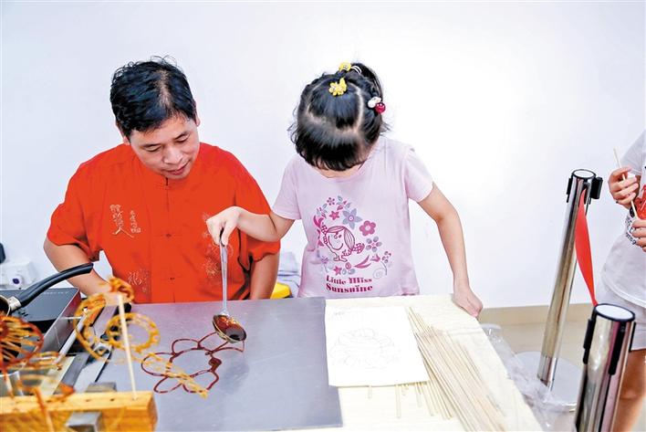 系列活動(dòng)中最受小朋友歡迎的還要屬糖畫了。糖畫是一種傳統(tǒng)民間手工藝,以糖為材料來(lái)作造型的。所用的工具僅一勺一鏟,糖料一般是紅、白糖加上少許飴糖放在爐子上用溫火熬制,熬到可以牽絲時(shí)即可用來(lái)澆鑄造型了。陪伴小朋友們的家長(zhǎng)表示,孩子親自動(dòng)手制作,既能加深對(duì)民間藝術(shù)的認(rèn)識(shí)和濃厚興趣,又能增強(qiáng)動(dòng)手能力,十分有意義。而小朋友們則認(rèn)為,不光可以學(xué),還可以吃,真好。