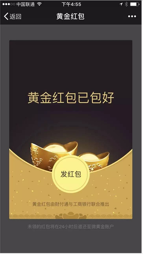 2、黃金紅包是基于財(cái)付通與工商銀行聯(lián)合推出的【騰訊微黃金】在線黃金交易創(chuàng)新產(chǎn)品基礎(chǔ)上的娛樂化紅包產(chǎn)品,目前仍處于內(nèi)測(cè)期,其入口設(shè)在【騰訊微黃金】微信公眾號(hào)中,產(chǎn)品的功能及體驗(yàn)也在逐步完善中。