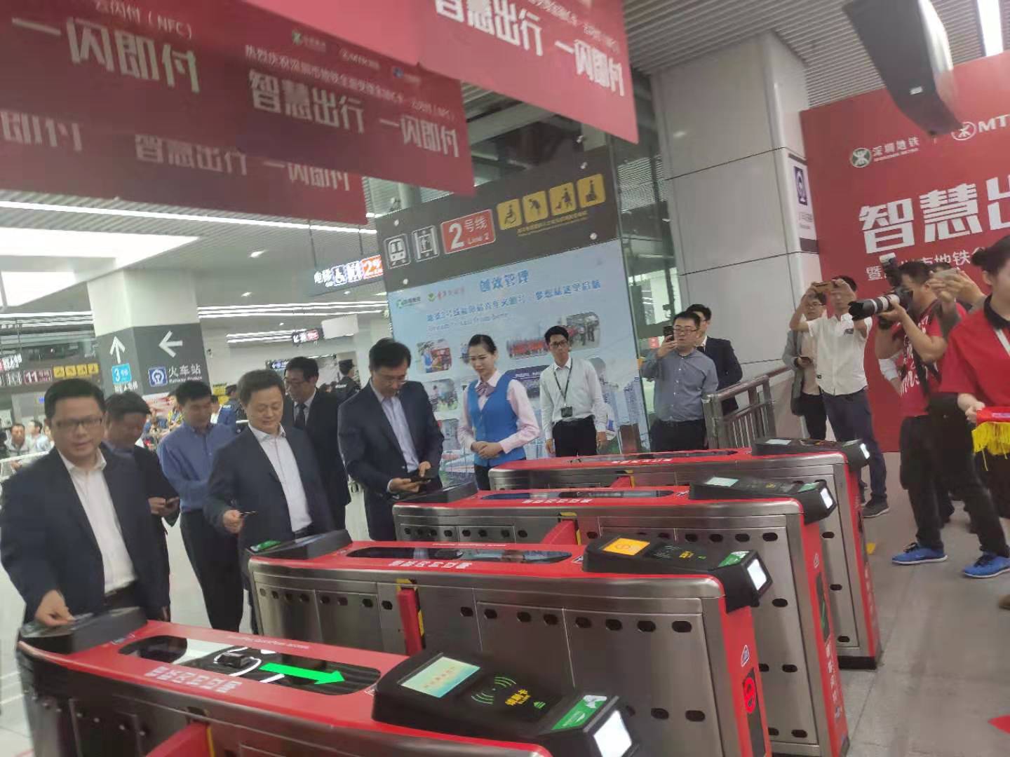 3月1日上午,五洲賓館內(nèi)舉行了“深圳市地鐵金融IC卡過閘服務(wù)”的啟動(dòng)儀式。中國(guó)人民銀行副行長(zhǎng)范一飛、深圳市人民政府副市長(zhǎng)艾學(xué)峰、招商銀行總行副行長(zhǎng)劉建軍、中國(guó)銀聯(lián)董事長(zhǎng)邵伏軍、招商銀行深圳分行行長(zhǎng)岳鷹、深圳地鐵董事長(zhǎng)辛杰、港鐵(深圳)總經(jīng)理黃琨暐等相關(guān)領(lǐng)導(dǎo)出席了啟動(dòng)儀式,并共同點(diǎn)亮LED燈幕,宣告深圳市地鐵8條線路的所有車站正式啟用過閘功能。