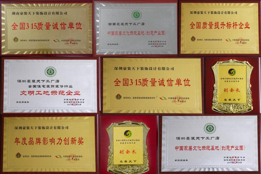 據(jù)悉,豪裝天下裝飾集團整裝集團已被授予“中國建筑裝飾協(xié)會住宅裝修委員會第二屆執(zhí)行會長”、“全國工商聯(lián)家具裝飾業(yè)商會家裝專業(yè)委員會副會長”、“中國建筑工程、室內(nèi)外裝飾、智能整裝優(yōu)質(zhì)企業(yè)”、“全國3·15質(zhì)量誠信單位”、“年度品牌影響力創(chuàng)新獎”、“全國質(zhì)量提升標(biāo)桿企業(yè)”、“文明工地示范企業(yè)”、“中國家居文化示范基地(創(chuàng)意產(chǎn)業(yè)園)”等系列榮譽?,F(xiàn)已成為中國裝飾行業(yè)的知名品牌。