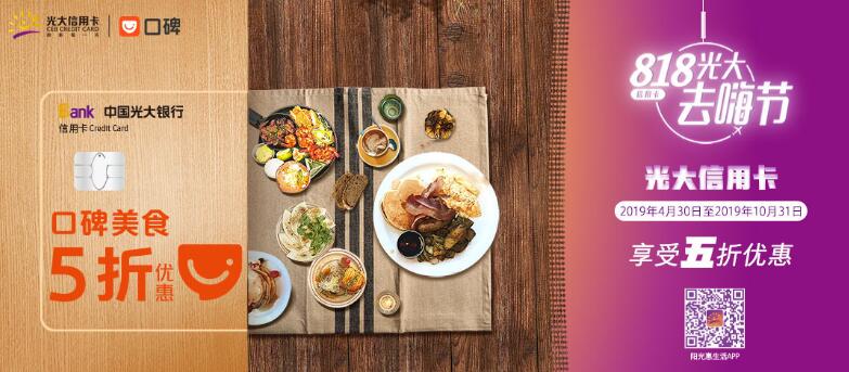 活動期間每周一至每周日,光大信用卡用戶且在支付寶實名認證個人用戶,在口碑平臺美食行業(yè)商戶處(休閑食品的商戶除外),使用支付寶賬戶綁定的光大銀行信用卡快捷支付進行當面付消費,有機會享受5折優(yōu)惠,最高15元優(yōu)惠封頂?;顒悠陂g每天限前8000個優(yōu)惠名額,名額有限,用完即止?;顒悠陂g同一用戶每月限享1次優(yōu)惠機會。(詳見陽光惠生活APP或口碑APP銀行卡特惠頻道,具體路徑見活動細則)。