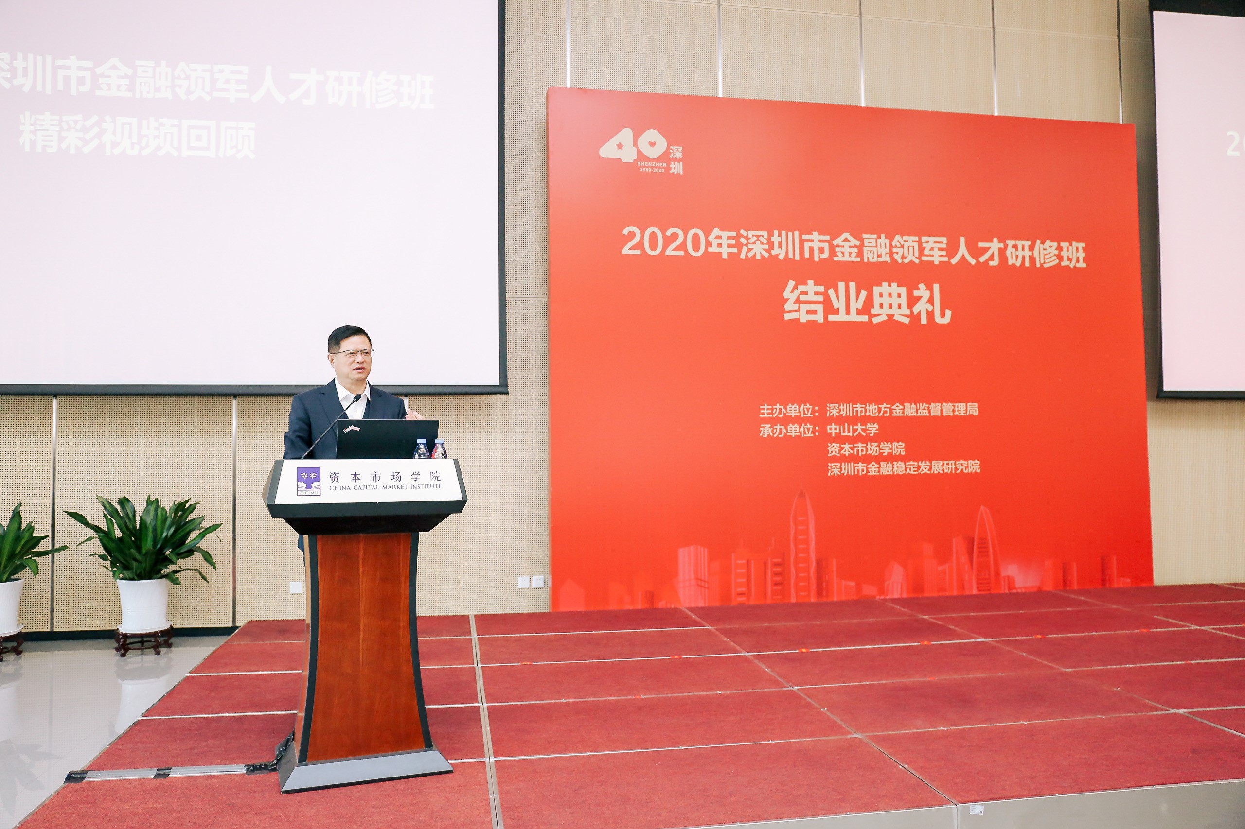 1月30日上午,2020年深圳金融領(lǐng)軍人才研修班結(jié)業(yè)典禮在資本市場學(xué)院隆重舉辦。本期研修班由深圳市地方金融監(jiān)督管理局主辦,中山大學(xué)、資本市場學(xué)院、深圳市金融穩(wěn)定發(fā)展研究院共同承辦。市地方金融監(jiān)管局黨組書記劉平生主持結(jié)業(yè)典禮并致辭,局長何杰作總結(jié)講話。資本市場學(xué)院副理事長、深圳市原副市長唐杰教授,資本市場學(xué)院黨委書記陳自強(qiáng)、院長金立揚(yáng)、副院長張韶輝,深圳銀保監(jiān)局副局長陳飛鴻、深圳證券交易所紀(jì)委書記邢力紅,市地方金融監(jiān)督管理局副巡視員林居正,中山大學(xué)嶺南學(xué)院院長陸軍教授,以及市委組織部、人民銀行深圳市中心支行、深圳證監(jiān)局有關(guān)領(lǐng)導(dǎo)應(yīng)邀出席,本期研修班近110名學(xué)員參加活動。