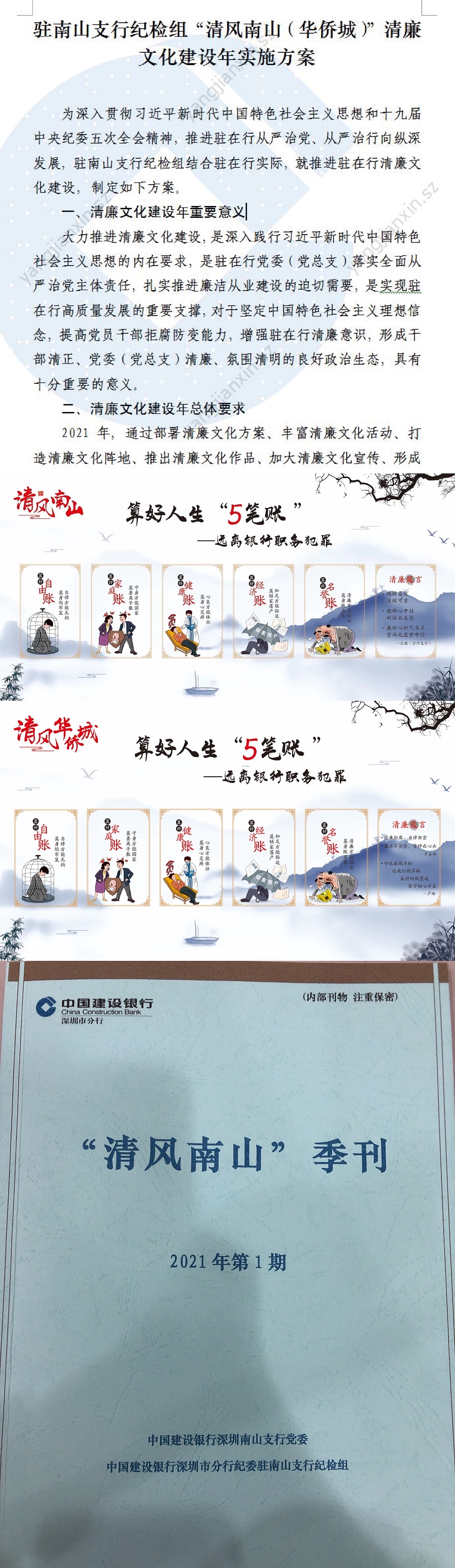深圳新聞網(wǎng)6月9日訊 為充分發(fā)揮清廉文化的教育、激勵、凝聚、導(dǎo)向和約束作用,響應(yīng)深圳銀行業(yè)保險業(yè)清廉金融文化核心理念,積極培育厚德養(yǎng)廉的政治生態(tài),著力助推駐在行干部清正、黨委清廉、政治清明、生態(tài)清朗的清廉文化建設(shè),近日,建行深圳市分行駐南山支行紀檢組制定推出了《“清風(fēng)南山(華僑城)”清廉文化建設(shè)年實施方案》。該方案以“6講”為依托,明確清廉文化建設(shè)5大任務(wù),即:弘揚清廉價值理念、豐富清廉文化活動、打造清廉文化陣地、推出清廉文化作品、攜手清廉文化共建。