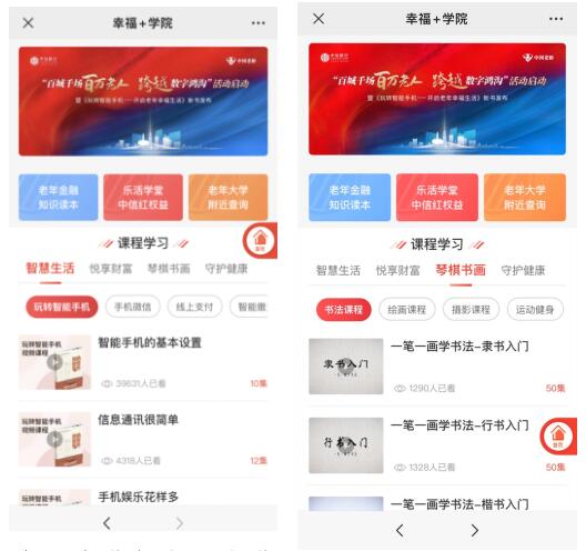 中信銀行專門(mén)給老年朋友準(zhǔn)備的“課程學(xué)習(xí)”一共有智能生活、悅享財(cái)富、琴棋書(shū)畫(huà)和守護(hù)健康四大板塊,都是老年朋友需要和關(guān)心的內(nèi)容,總課程2000余節(jié),總時(shí)長(zhǎng)超過(guò)1.8萬(wàn)分鐘。
