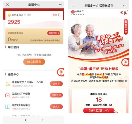 中信銀行“幸福+俱樂(lè)部”“幸福+財(cái)富”頁(yè)面展示
