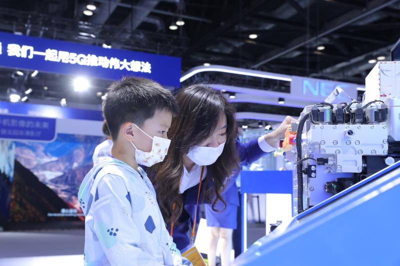 在服貿(mào)會現(xiàn)場,一個小男孩躲在奶奶身后好奇的地望著中國太保展臺上的氫能源發(fā)動機(jī)。