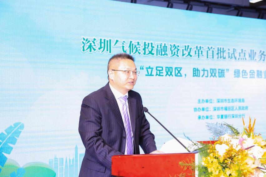 國(guó)家生態(tài)環(huán)境部氣候司司長(zhǎng)李高,深圳市政府副秘書長(zhǎng)劉昂,深圳市生態(tài)環(huán)境局局長(zhǎng)李水生,深圳市委改革辦副主任孫華明,福田區(qū)政府副區(qū)長(zhǎng)朱江,華夏銀行總行黨委委員、營(yíng)銷總監(jiān)、深圳分行黨委書記、行長(zhǎng)陳傳龍等領(lǐng)導(dǎo)出席。深圳市政府、深圳市生態(tài)環(huán)境局、市委改革辦、中國(guó)人民銀行深圳市中心支行、福田區(qū)政府相關(guān)負(fù)責(zé)人、深圳市綠色企業(yè)代表、深圳市綠色相關(guān)行業(yè)協(xié)會(huì)代表、華夏銀行深圳分行相關(guān)單位代表等70余人參加活動(dòng)。