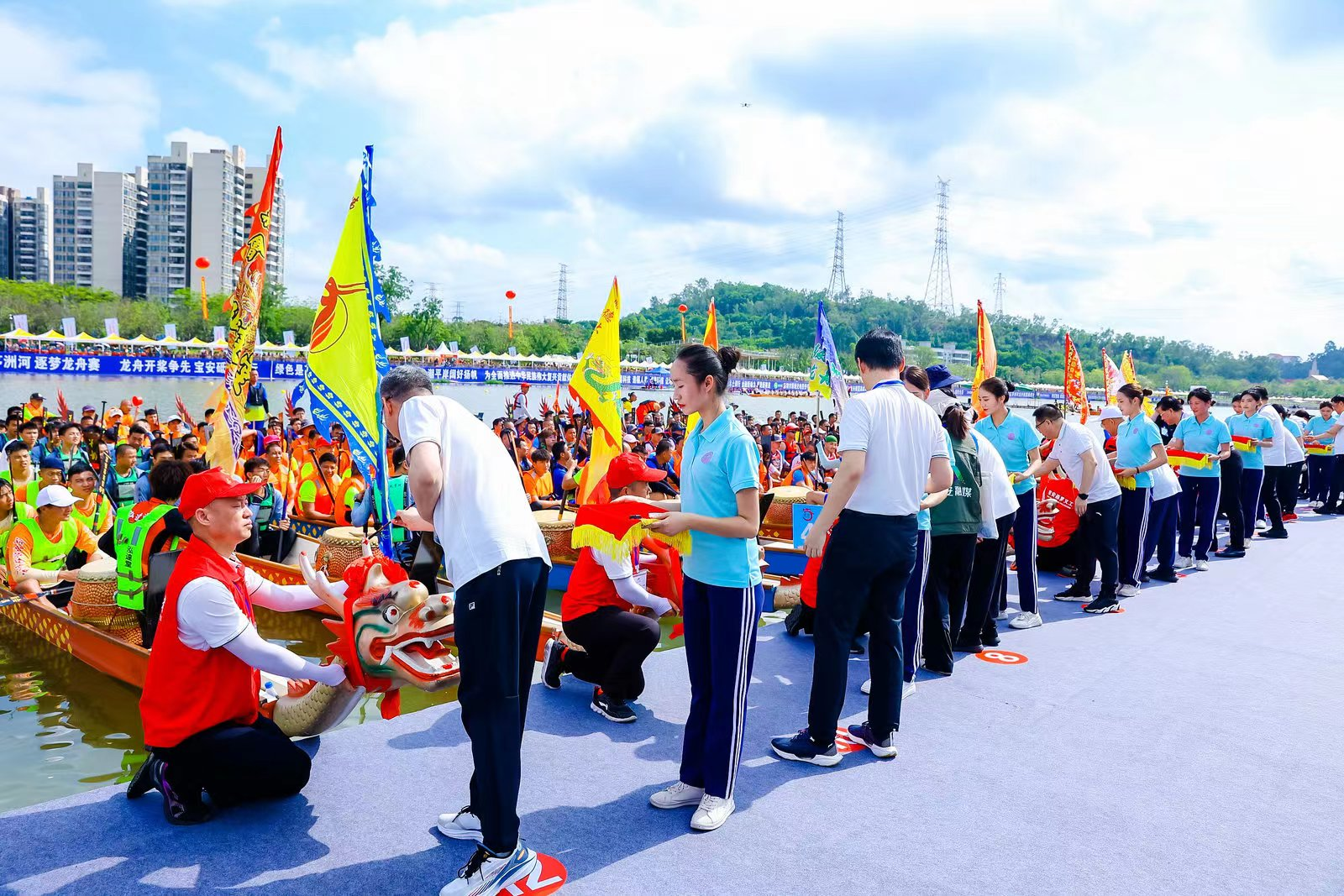 活動在鏗鏘有力的鼓點《龍鼓起舞》中拉開帷幕,隨后深圳農商銀行相關負責人受邀與眾嘉賓一起為龍舟點睛,龍舟點睛是龍舟競渡前舉行的傳統(tǒng)儀式,是傳統(tǒng)龍舟文化的主要內容之一。經過激烈的比拼,新會泓達堂陳皮龍舟隊榮獲粵港澳男子組冠軍,東莞萬江南方科技龍舟隊榮獲粵港澳女子組冠軍,燕羅街道塘下涌江夏黃氏龍舟隊獲得本地組第一名。