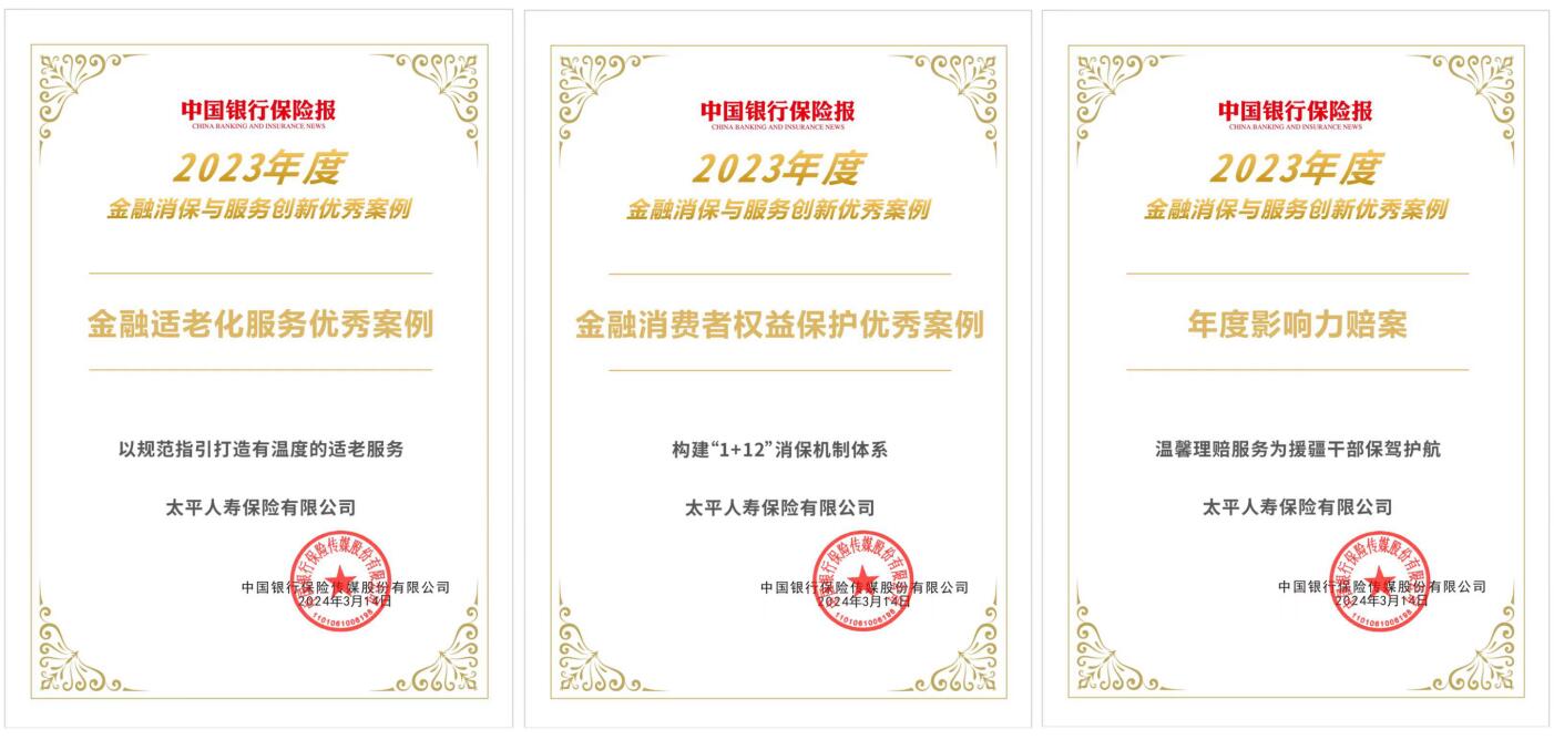 深圳新聞網2024年3月15日訊(記者 朱琳 通訊員 宋超群)3月14日,由《中國銀行保險報》主辦的2024金融消保與服務創(chuàng)新主題活動在京舉辦,現(xiàn)場公布了2023年度金融消保與服務創(chuàng)新優(yōu)秀案例名單,太平人壽三項案例榜上有名,分別入選金融適老化服務優(yōu)秀案例、年度影響力理賠案例、消費者權益保護優(yōu)秀案例。