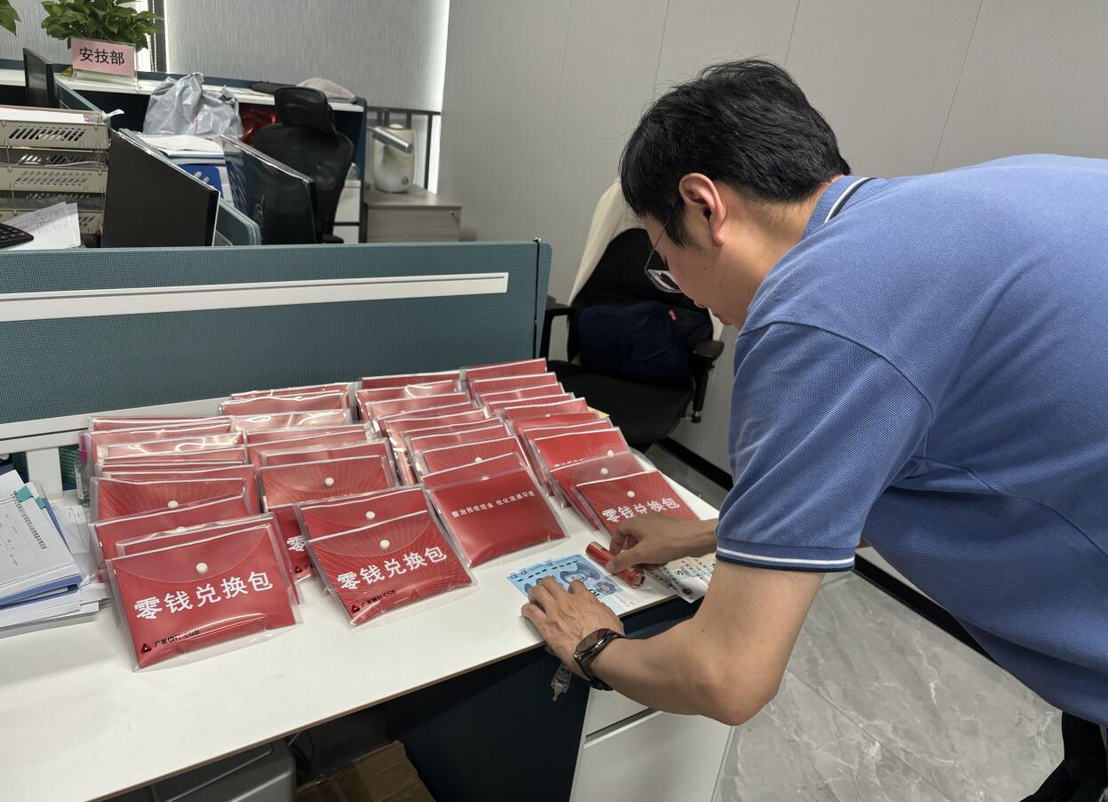 “經(jīng)常碰到老年人或者外國人打車時(shí)給我一百元的大鈔,可我沒有零錢找啊,需要開到路邊等客戶去便利店或商鋪換零錢。現(xiàn)在廣發(fā)銀行上門來給我換零錢,幫我解決了大問題,可以節(jié)約時(shí)間多接幾個(gè)單,多賺點(diǎn)錢嘍!”出租車司機(jī)李師傅興奮地說道。僅一分鐘,他便兌換好了一個(gè)200元的零錢包。