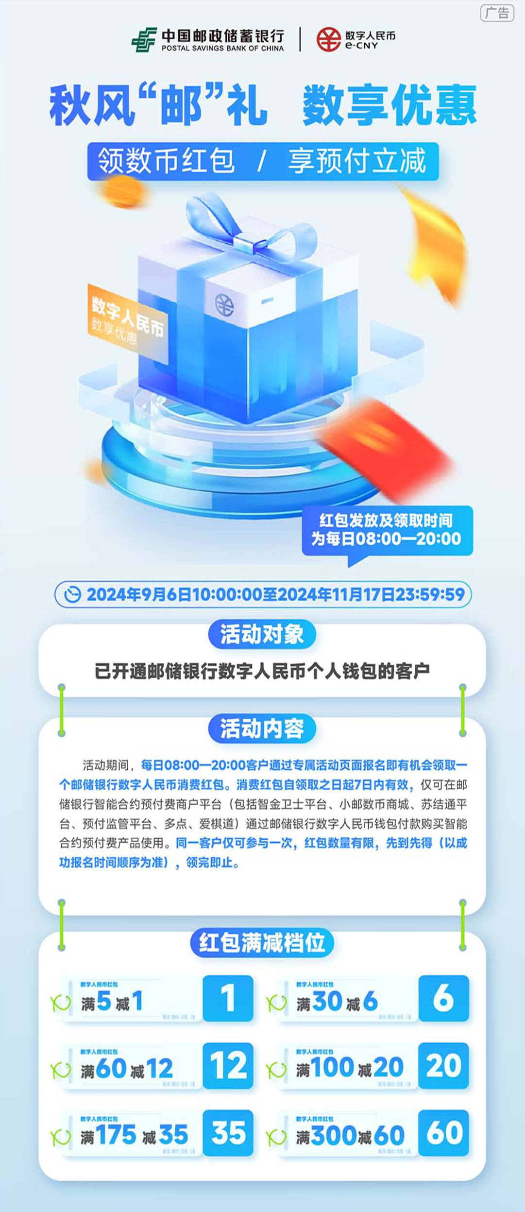2024年9月6日10:00至2024年11月17日23:59,已開通郵儲(chǔ)銀行數(shù)字人民幣錢包的客戶,活動(dòng)期間,每日08:00-20:00客戶通過專屬活動(dòng)頁面報(bào)名即有機(jī)會(huì)領(lǐng)取一個(gè)郵儲(chǔ)銀行數(shù)字人民幣消費(fèi)紅包。消費(fèi)紅包自領(lǐng)取之日起7日內(nèi)有效,僅可在郵儲(chǔ)銀行智能合約預(yù)付費(fèi)商戶平臺(tái)(包括智金衛(wèi)士平臺(tái)、小郵數(shù)幣商城、蘇結(jié)通平臺(tái)、預(yù)付監(jiān)管平臺(tái)、多點(diǎn)、愛棋道)通過郵儲(chǔ)銀行數(shù)字人民幣錢包付款購買智能合約預(yù)付費(fèi)產(chǎn)品使用。同一客戶僅可參與一次,紅包數(shù)量有限,先到先得(以成功報(bào)名時(shí)間順序?yàn)闇?zhǔn))領(lǐng)完即止。