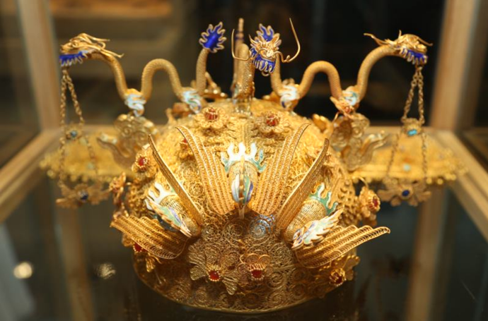 此次文博會(huì),楚釹子品牌展出鳳冠霞帔婚配系列、宅配梅蘭竹菊系列、佛像系列產(chǎn)品等近百余件。其中鳳冠霞帔系列作品,以巧妙的花絲鑲嵌技藝,糅合中國傳統(tǒng)技藝,融入現(xiàn)代婚紗設(shè)計(jì)理念,打造出流光溢彩、雍容華貴的現(xiàn)代宮廷藝術(shù)之美。
