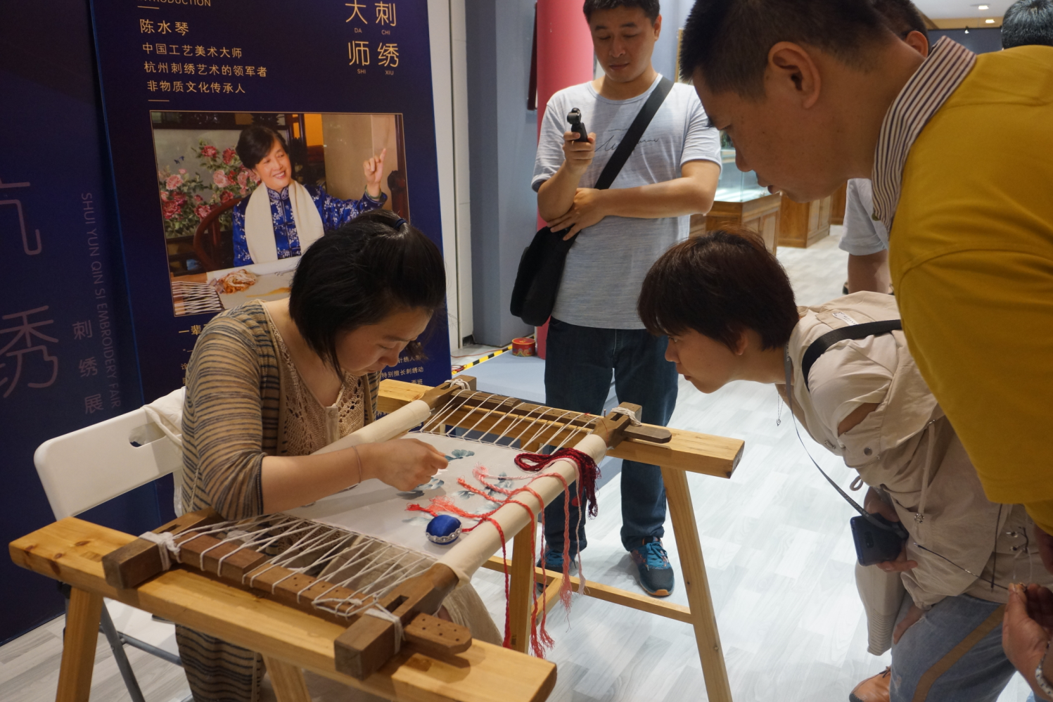 中國工藝美術(shù)大師陳水琴親臨現(xiàn)場,為九方藝術(shù)空間揭牌,現(xiàn)場指導(dǎo)此項技藝的傳承人為現(xiàn)場觀眾進行技藝演示,同時為參加活動的嘉賓和藝術(shù)愛好者們開展簽名送書活動。讓更多的人了解中華民族的優(yōu)秀文化遺產(chǎn),向大眾更好地宣傳、展示杭繡這項非物質(zhì)文化遺產(chǎn)的魅力,弘揚和傳播我國的優(yōu)秀傳統(tǒng)文化。展覽至19日,廣大市民可前往參觀,體驗杭繡之美。