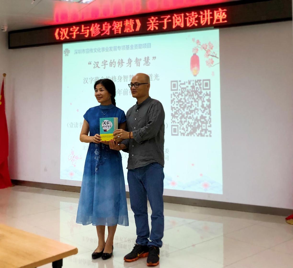 講座在親子之間、講者與聽眾之間充滿趣味性的互動(dòng)中接近尾聲,劉建彪先生向龍湖社區(qū)黨群服務(wù)中心圖書館贈(zèng)送《漢字與修身智慧》書籍,希望更多的青少年用心感受中華優(yōu)秀傳統(tǒng)文化之美。