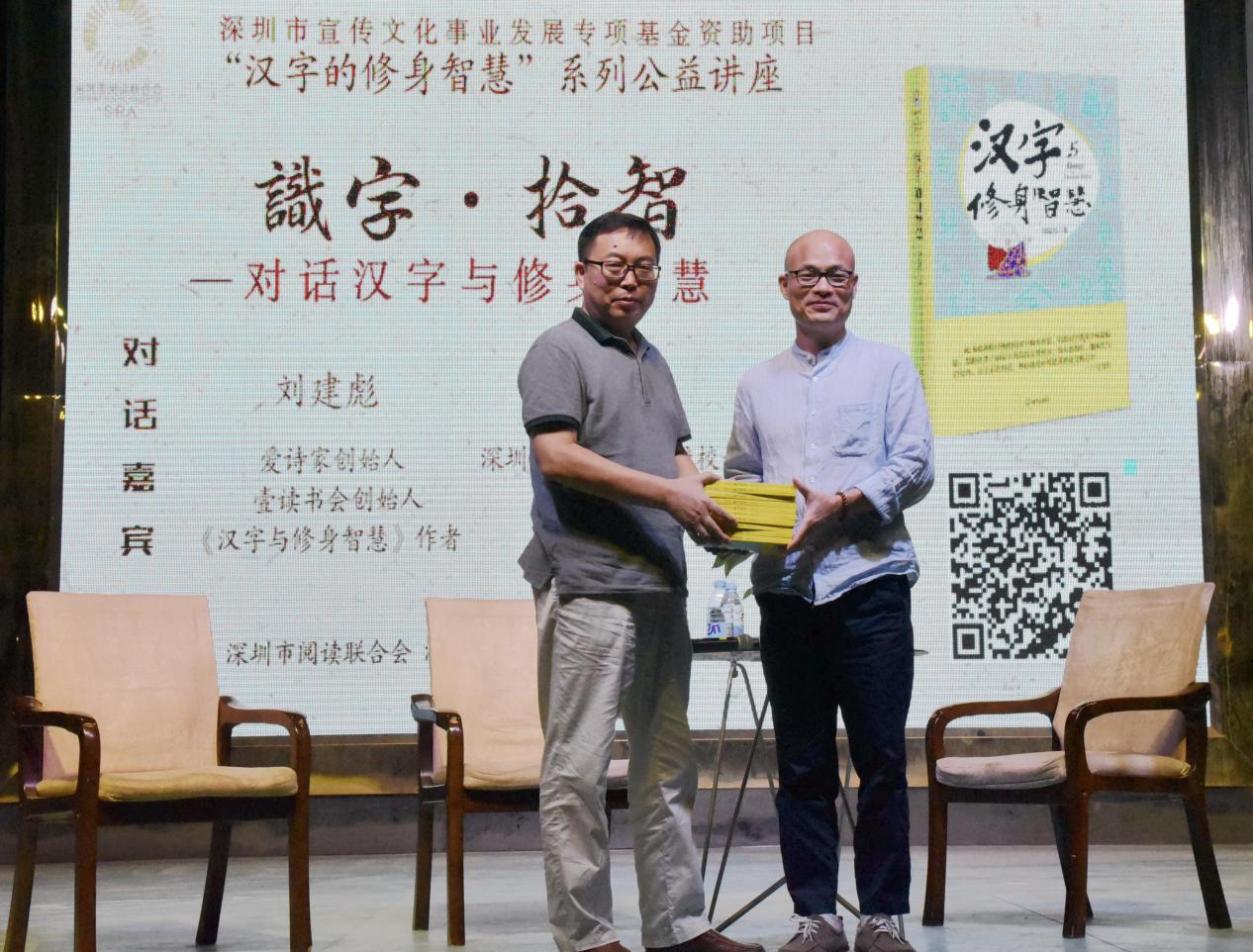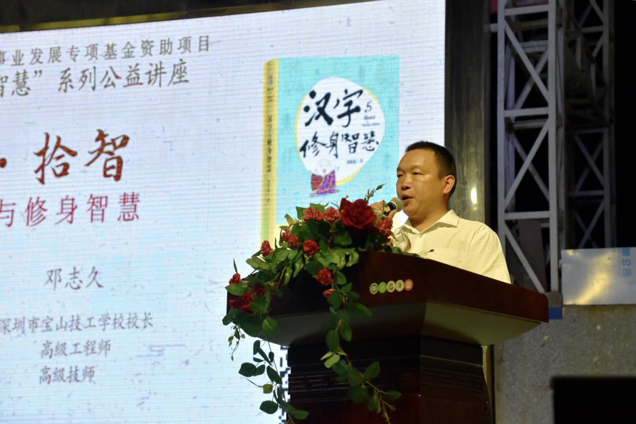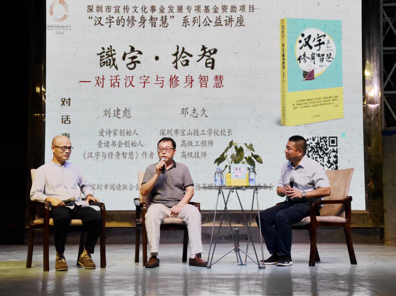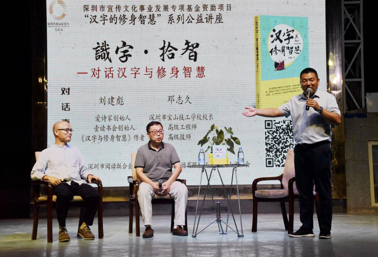 深圳新聞網(wǎng)訊 9月18日晚上7時(shí),由深圳市閱讀聯(lián)合會、深圳市壹書文化傳播有限責(zé)任公司和寶山讀書會共同主辦的“‘識字拾智’——對話漢字與修身智慧”公益文化講座在寶山技工學(xué)校寶山大舞臺拉開了序幕。據(jù)悉,這是由深圳市宣傳文化事業(yè)發(fā)展專項(xiàng)基金資助項(xiàng)目“漢字的修身智慧”的第三場公益文化講座,以劉建彪《漢字與修身智慧》新書分享為契機(jī),傳播漢字正能量,讓更多的青少年識字長智,領(lǐng)略漢字文化之精妙。