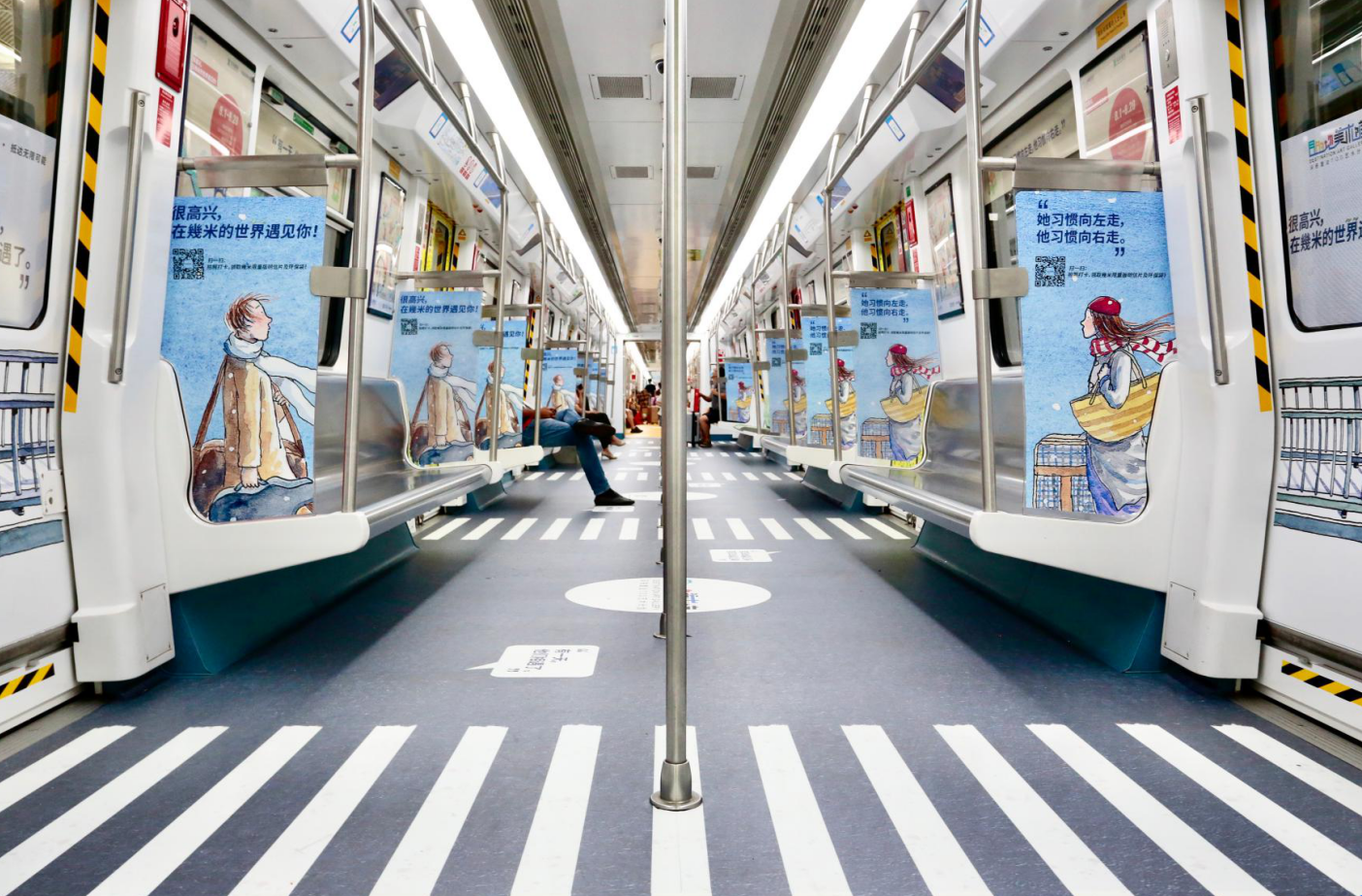 “我信仰藝術(shù),我覺得它太……太厲害了!”因為希望把藝術(shù)的美好分享給所有人,幾米創(chuàng)作時總是盡量把自己最在乎的故事和結(jié)構(gòu)變得更簡單些,打破國界,讓全世界的讀者和畫迷都能在他的故事里找到共鳴與寄托。為了更好地傳遞這種藝術(shù)體驗,本次藝術(shù)計劃還讓幾米筆下的人物走進地鐵車廂和站廳,等待人們的不期而遇。觀眾在列車或站點打卡拍照,參與“在幾米的世界遇見你”征集活動,就有機會獲得“目的地美術(shù)館”限量版幾米明信片和環(huán)保袋。