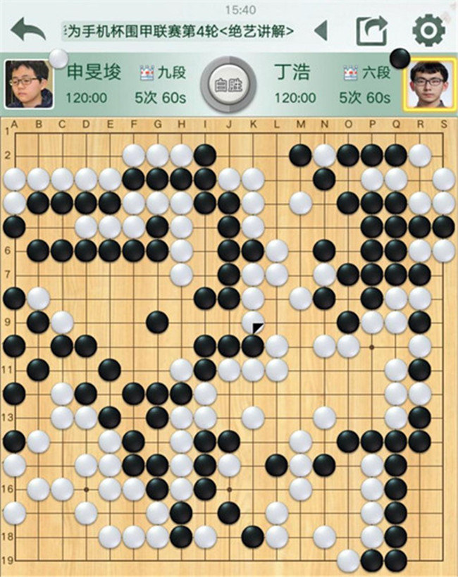 陶欣然執(zhí)白對(duì)陣鄔光亞。黑棋右邊攻擊白棋時(shí)候,連續(xù)失誤,反被白棋妙手吃通棋筋,黑已無(wú)法逆轉(zhuǎn)局面。有意思的是,賽前陶欣然遲到2分鐘被罰2分鐘,但絲毫不影響他獲勝。