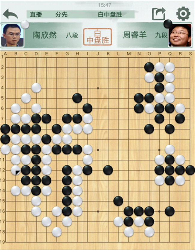 第一臺,陶欣然執(zhí)白對陣世界冠軍周睿羊。中盤白棋在右邊黑棋空里制造打劫進行騰挪,