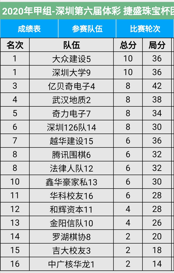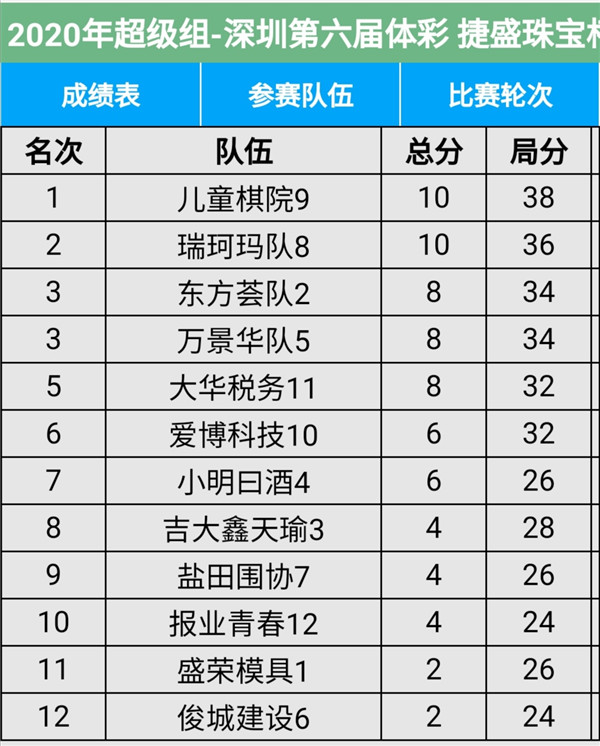 見圳客戶端?深圳新聞網(wǎng)2020年11月8日訊(記者周錦春)第六屆“體彩?捷盛珠寶杯”深圳市圍棋聯(lián)賽繼續(xù)在羅湖區(qū)藝嘉大酒店展開,今天是第二場,有第4輪至第6輪的比賽。目前,超級組中,兒童棋院隊、瑞珂瑪隊領先;甲級組中,大眾建設、深圳大學領先。具體賽程結果請看本文附后表格。