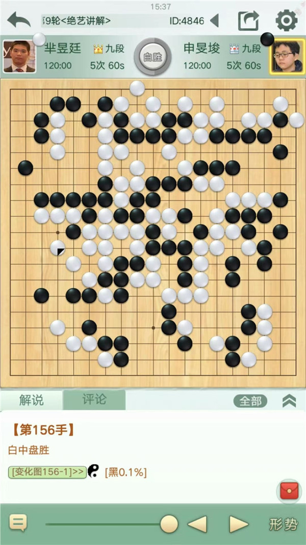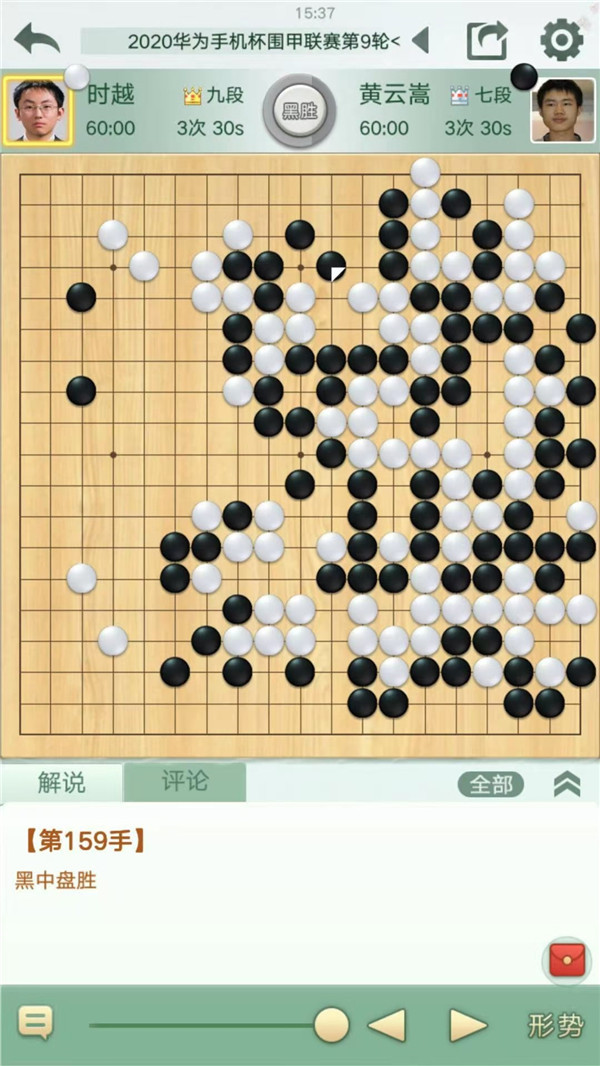 快棋臺由深圳宏發(fā)隊的時越九段執(zhí)白對陣江蘇隊的黃云嵩七段。開局一個局部黑棋應(yīng)對欠妥,白方取得大優(yōu),然而時越之后的下法不夠簡明,被黑棋抓住了機會,局面變得混亂。在之后雙方大龍的接觸戰(zhàn)中,白方再次放棄簡明做活的下法,與黑棋大龍形成雙活,但結(jié)局是外圍厚薄損失慘重,白棋下成后手雙活之后無暇顧及下方大龍安危,被黑棋一舉擊潰。