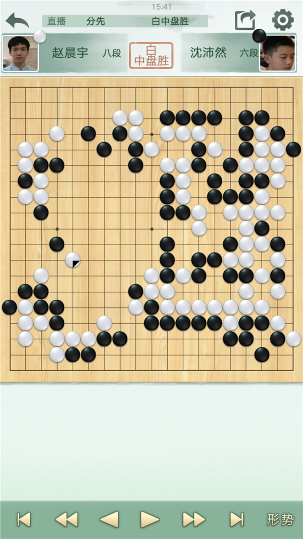慢棋第四臺由深圳宏發(fā)隊的沈沛然六段執(zhí)黑對陣江蘇隊的趙晨宇八段。白方開局步調(diào)良好,局面小優(yōu)。中盤時黑方企圖沖擊白棋薄味,但未能找到較為有效的手段。在形勢較為不利的情況下,沈沛然選擇了強行開劫拼搏,但無奈劫材不夠,轉(zhuǎn)換之后繼續(xù)虧損,再難挽回局面,可以說是白棋完勝的一局。