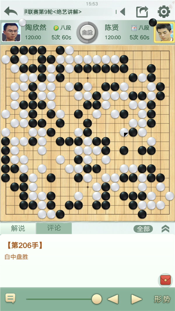慢棋第一臺由深圳宏發(fā)隊的陶欣然八段執(zhí)白對陣江蘇隊的陳賢八段。雙方開局下出一個復(fù)雜的大型變化,局面一度兩分。序盤結(jié)束時陶欣然下出一步緩手,使得勝負的天秤向黑方傾斜。弈至官子階段,黑方下出了大意的敗招,單官沖斷白兩塊活棋,相當于自停一手,使得白棋追回不少目數(shù)。之后黑棋如繼續(xù)收官局面仍然細微,但陳賢在出現(xiàn)失誤后心態(tài)失衡,孤注一擲殺白大龍,最終失敗,白棋幸運獲勝。