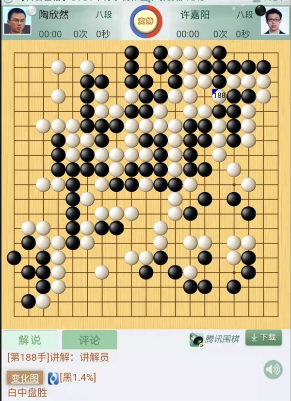 第一臺慢棋,由深圳隊的陶欣然八段執(zhí)白對陣江西隊的許嘉陽八段。雙方開局平穩(wěn),中盤黑棋侵消左邊白棋大模樣時行棋過分,遭到白棋反擊后黑棋較為危險。隨即作戰(zhàn)形成對殺,白棋沒有下出簡明的快一氣變化,連續(xù)失誤后形成黑棋有利的劫爭。劫爭中黑棋卻出現(xiàn)嚴(yán)重失誤,由殺白變成了白棋便宜巨大的轉(zhuǎn)換,最終投子認(rèn)負(fù),陶欣然執(zhí)白中盤勝許嘉陽。