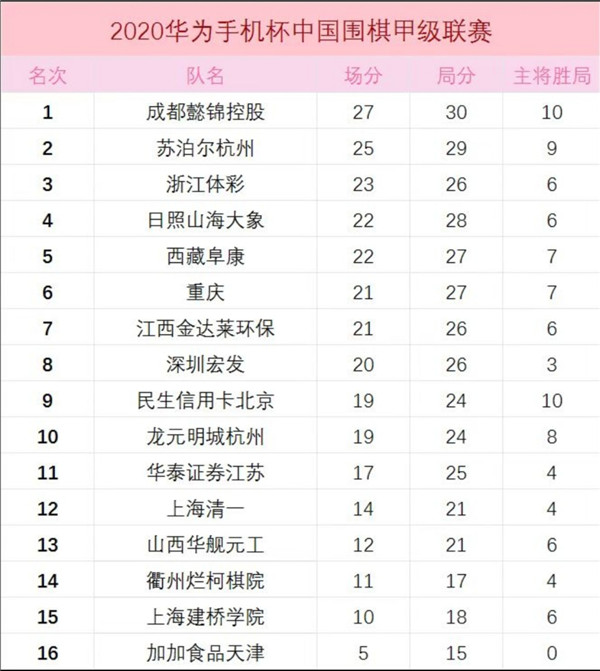 本輪其它隊賽果如下:衢州爛柯棋院0:4負(fù)西藏阜康;成都懿錦控股3:1勝日照山海大象;上海清一隊3:1勝華泰證券江蘇;民生信用卡北京4:0勝天津加加食品;重慶1:3負(fù)蘇泊爾杭州;山西華艦元工4:0勝上海建橋?qū)W院;浙江體彩2:2主將負(fù)龍元明城杭。