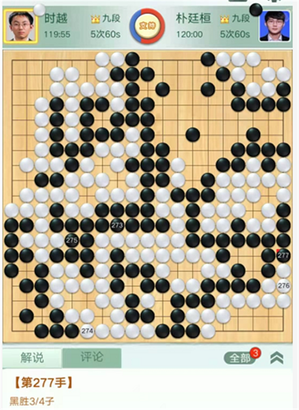 第二臺主將,由深圳隊時越九段執(zhí)白對陣成都隊韓國世界冠軍樸廷桓九段。開局下方雙方各有小失誤,局面均勢。之后左上黑棋行棋過分,白棋領(lǐng)先。白棋在黑右上角破空形成打劫,黑棋連走兩手分開右邊白棋進行攻擊。白棋治孤中錯失簡明獲勝的下法,但是活出后依然稍好。緊接著白棋沒有選擇最大的官子,被黑棋走到后黑棋領(lǐng)先。之后黑棋官子收束滴水不漏,以最小差距3/4獲勝。時越執(zhí)白3/4子負樸廷桓。