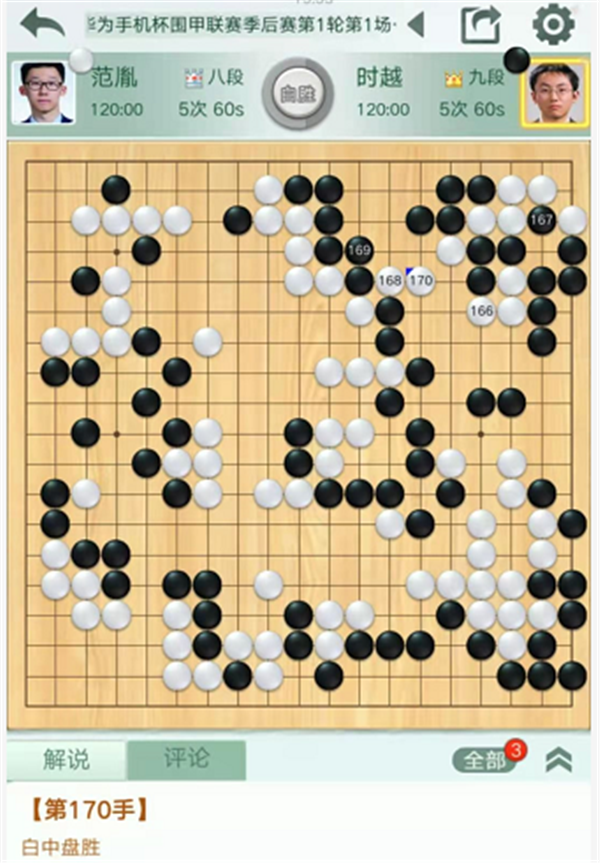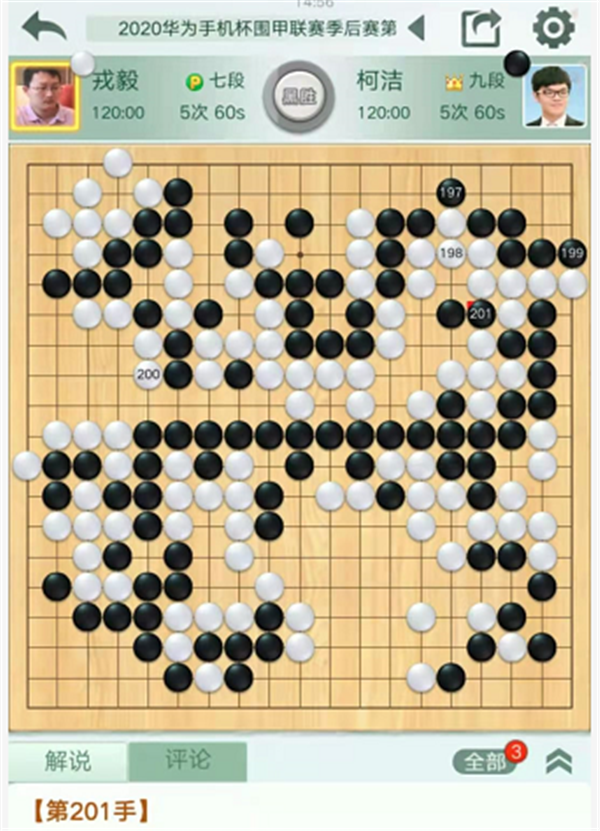 第三臺(tái)慢棋,由深圳隊(duì)的戎毅七段執(zhí)白對(duì)陣民生隊(duì)的柯潔九段。戎毅執(zhí)白對(duì)陣柯潔。開局左下變化新穎,白棋略有所得。之后右下角戰(zhàn)斗形成轉(zhuǎn)換,局面依然白好。右邊戰(zhàn)斗中黑棋形狀處理失誤,白棋簡單整形將是大優(yōu)勢局面,但是白棋選擇了復(fù)雜的殺黑大龍的變化。最后白棋選擇和黑棋互相分?jǐn)鄬?duì)殺的話,將是白棋正好不行,實(shí)戰(zhàn)不得不放黑棋大龍連回后,白棋敗勢。最終戎毅執(zhí)白中盤負(fù)柯潔。