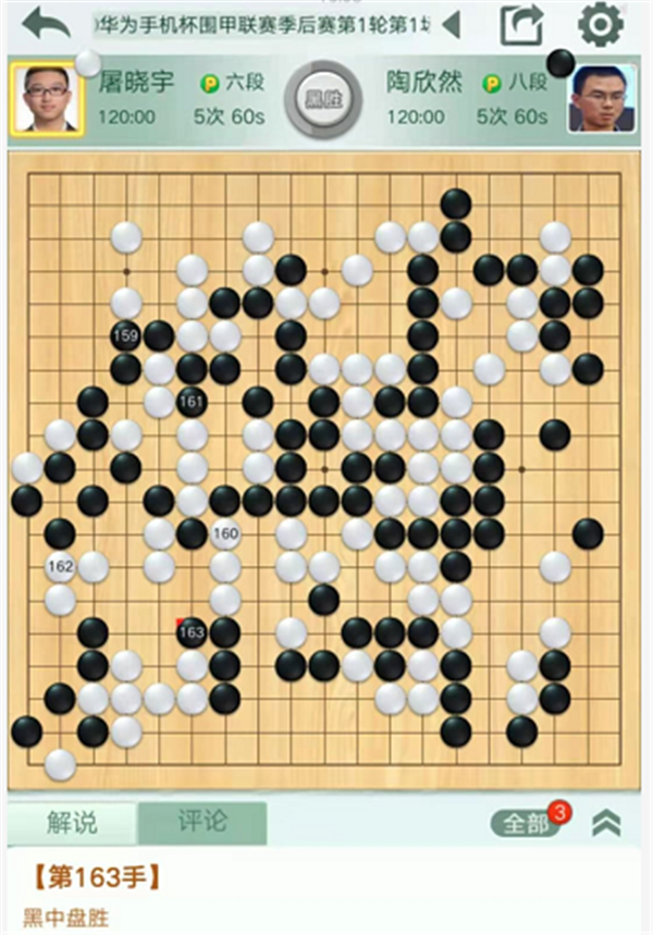 第四臺(tái)慢棋,由深圳隊(duì)陶欣然八段執(zhí)黑對(duì)陣民生隊(duì)的屠曉宇六段。開局雙方互圍大模樣。白棋右邊在黑空試應(yīng)手時(shí)黑方強(qiáng)烈反擊。白棋沒有下出做活的手段,不得不付出很大代價(jià)出頭跑出,黑優(yōu)勢。之后中央白棋混戰(zhàn)中戰(zhàn)略方向錯(cuò)誤,黑棋優(yōu)勢擴(kuò)大。最后黑棋在左邊白棋空里薄弱處出棋,一舉獲勝。陶欣然執(zhí)黑中盤勝屠曉宇。