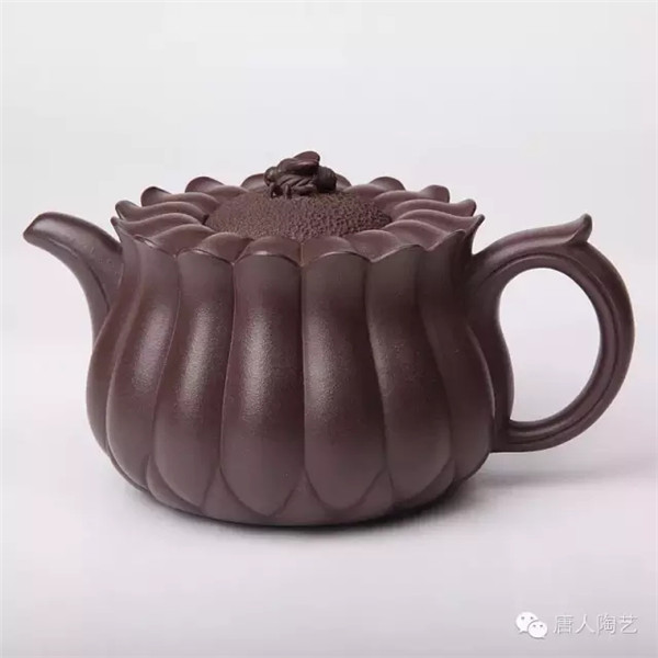 第一件,《蜂菊壺》取材于大自然蜜蜂采蜜之情形,立意新穎。壺身等分成十六瓣,俯視如盛開的菊花,蓋為花蕊,壺鈕設(shè)計(jì)成正在花蕊上采蜜的蜜蜂。顯得靜中有動(dòng),生機(jī)盎然,側(cè)視該壺,筋囊飽滿凝重,通體線條流暢,大氣中不乏精巧。菊花與蜜蜂肖形逼真,洋溢著大自然的和諧情趣。據(jù)說(shuō),唐朝霞老師為制作此壺,多次徘徊在桃花林里、菊花叢中,觀察蜜蜂的神態(tài),巧妙地讓蜜蜂造型躍然“蜂菊壺”壺鈕上,靜中寓動(dòng),令人叫絕。