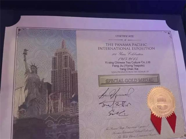 據(jù)悉,此次在美國(guó)舉行的巴拿馬太平洋萬(wàn)國(guó)博覽會(huì)百年慶大會(huì)上,共有來(lái)自全球30多個(gè)國(guó)家5000個(gè)品種參展,盛況空前,共評(píng)出3個(gè)特等獎(jiǎng)、10個(gè)金獎(jiǎng)以及銀獎(jiǎng)、銅獎(jiǎng)、優(yōu)秀獎(jiǎng)若干。唐朝霞的作品能夠獲得兩項(xiàng)大獎(jiǎng),無(wú)疑是宜興紫砂的杰出代表。百年之前的1915年,宜興紫砂在首屆巴拿馬太平洋萬(wàn)國(guó)博覽會(huì)上也曾讓世界為之傾倒,程壽珍的“掇球壺”、范大生的“大柿子壺”獲頭等獎(jiǎng)。1933年,在美國(guó)芝加哥萬(wàn)國(guó)博覽會(huì)上,宜興紫砂再次轟動(dòng)世界,范大生的“合棱壺”、俞國(guó)良的“四方傳爐壺”、汪寶根的“東坡壺”、朱可心的“竹節(jié)鼎”喜獲金獎(jiǎng)。國(guó)人眾所周知,茅臺(tái)酒是榮獲巴拿馬萬(wàn)國(guó)博覽會(huì)金獎(jiǎng)一舉成名的,而今,宜興唐朝霞的《蜂菊》壺獲得本次活動(dòng)的特別金獎(jiǎng)、《丹鳳朝陽(yáng)》壺獲得金獎(jiǎng),喻示著:唐朝霞的作品不僅走出了宜興、走到深圳,還走出了國(guó)門、走向了全世界!