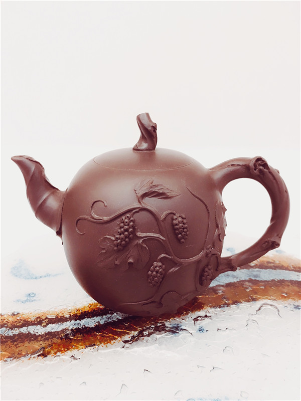 第二件,《碩果累累壺》的壺身為一顆碩大成熟的葡萄,壺把,壺嘴及壺鈕是以葡萄枝葉,葉蔓自枝干引向壺體,綴以累累的果實(shí),整體飽滿壯碩,情趣盎然。