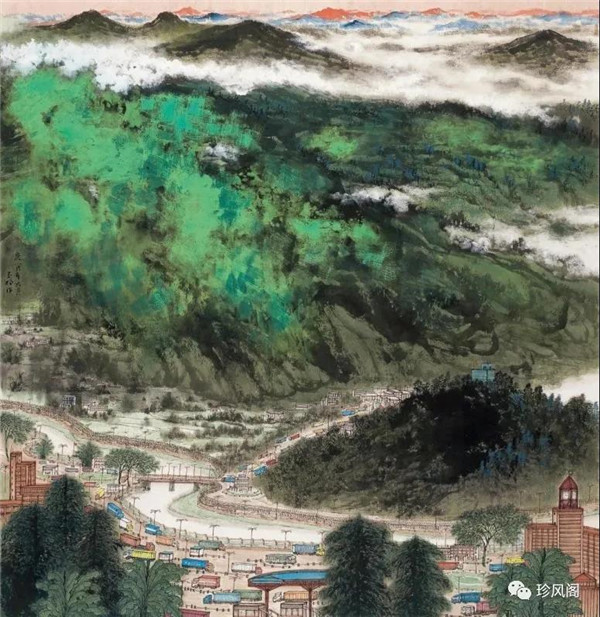 來自南京而定居于深圳的宋玉明,試圖將新金陵畫派表現(xiàn)現(xiàn)實的變革精神用于現(xiàn)代城市山水畫的探索上。作為新金陵畫派的第二代畫家,宋玉明直接承傳了宋文治表現(xiàn)現(xiàn)代太湖人居環(huán)境秀潤而精巧的家法,并將此種大山景加小民居的畫法轉用到深圳城市形態(tài)的表現(xiàn)上。這里,我們一方面可以看到深圳作為一個新興的現(xiàn)代城市借山而筑、注重自然環(huán)境在城市生態(tài)建設上的積極作用;另一方面,深圳這種與自然相統(tǒng)一的現(xiàn)代化城市建設理念,也為宋玉明進行城市山水畫創(chuàng)作提供了完美的表現(xiàn)對象。在《深圳文錦渡》等作品里,我們看到了畫家巧妙地將城市現(xiàn)代建筑與自然山水融為一體的表現(xiàn)。這些畫作,大多以勾線渲染的方法表現(xiàn)遠景中的商用或市政建筑設施,也因這些建筑被設置在中遠景,不僅減少了建筑塑造的困窘,而且突出了這些人居建筑與自然相得益彰的和諧關系。這些畫作,從嚴格的意義上說,仍然是山水畫,而宋式小散鋒皴以及云煙雨霧的渲染,也為畫面增添了幽深、恬靜、高雅、平和的意趣與境界。這些畫作,讓我們所熟悉的城市從一個相對遙遠的視角來觀看,既因距離產生了一種從未體驗過的美感,也較好地體現(xiàn)了現(xiàn)代城市與自然占位的協(xié)調統(tǒng)一、舒適宜居的比例關系。
