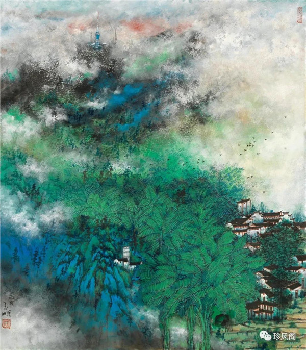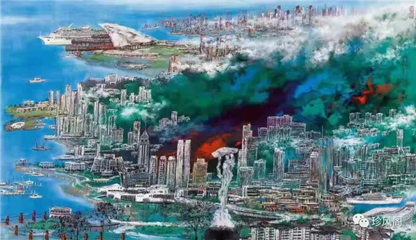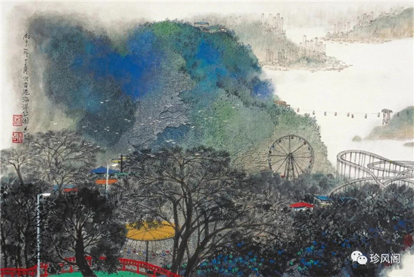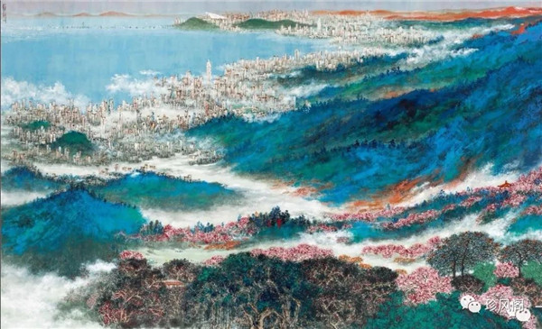 宋玉明從金陵畫派的新傳統(tǒng)跨越到城市表現(xiàn)的積彩拓墨畫法,既體現(xiàn)了現(xiàn)代化城市對于變革傳統(tǒng)的時代訴求,也體現(xiàn)了他移居深圳后這座新興城市文化對于他的深刻影響。畢竟,連續(xù)數(shù)屆的深圳水墨雙年展對于水墨在跨文化中重要作用與表現(xiàn)方法的突破,都給予他至深的思想開拓。這表明,城市山水畫已不單純是用中國畫表現(xiàn)城市的命題,而是其中能夠蘊含多少城市文化觀念與城市審美的方法,宋玉明對于城市山水畫的探索,體現(xiàn)的正是這樣一種對城市現(xiàn)代文化的思想融合性。而不拘謹于城市一磚一石、一街一道、一房一樓的描繪,著眼于發(fā)揮水墨與彩墨表現(xiàn)的自由性,抑或體現(xiàn)了人性、自然與現(xiàn)代城市共同作用的現(xiàn)代生活方式與人文理想。的確,純粹用中國畫或水墨畫來探索城市的現(xiàn)代化景觀表現(xiàn),也許只是淺層次的審美需求;而只有當把山水畫作為人與自然和諧統(tǒng)一的觀念表達植入城市現(xiàn)代化的審美訴求時,城市山水畫才能真正凸顯出其深刻的美學價值。這正是我們從宋玉明的作品里能夠讀解到的他對于城市山水畫審美理想的一種勾畫。