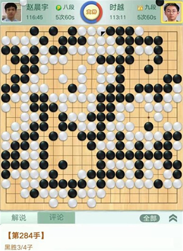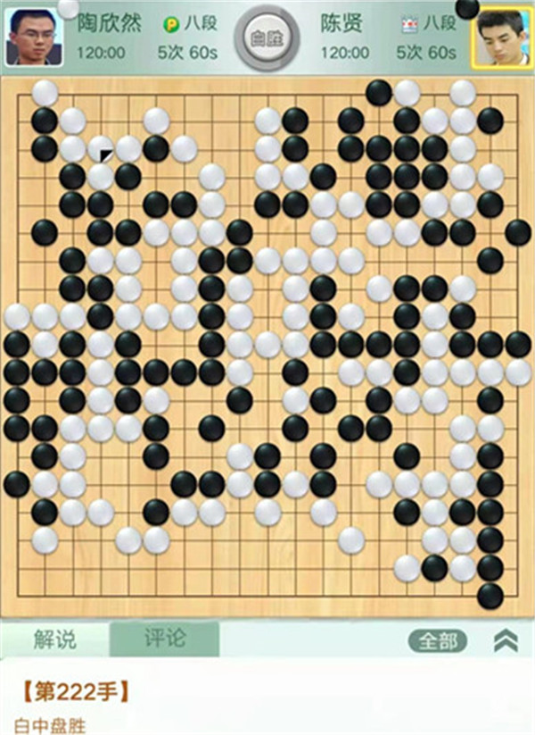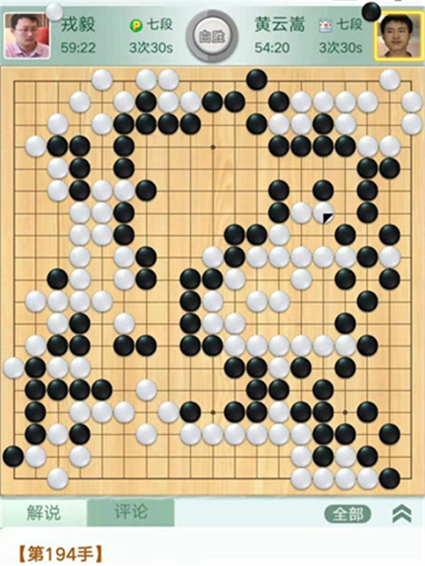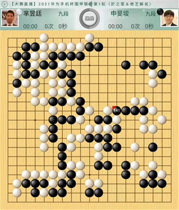 今日比賽中,申旻俊主將執(zhí)黑對(duì)陣新二冠羋昱廷,開(kāi)局左上角申旻俊配合小米使出羋氏飛刀,結(jié)果是飛刀不成功黑棋局面領(lǐng)先。中盤黑棋攻擊中央白棋時(shí),白棋脫先搶占實(shí)地。被黑手起刀落斬殺大龍,局終。快棋臺(tái),去年屢立戰(zhàn)功的戎毅七段執(zhí)白對(duì)陣黃云嵩七段,行棋穩(wěn)健,占居三個(gè)角之后,又在中間活出一大塊,行棋至194手勝。三臺(tái)陶欣然八段對(duì)陣陳賢八段,行棋222手白中盤勝。四臺(tái)時(shí)越九段對(duì)趙晨宇一戰(zhàn),行至284手,以四分之三子微弱優(yōu)勢(shì)取勝。
