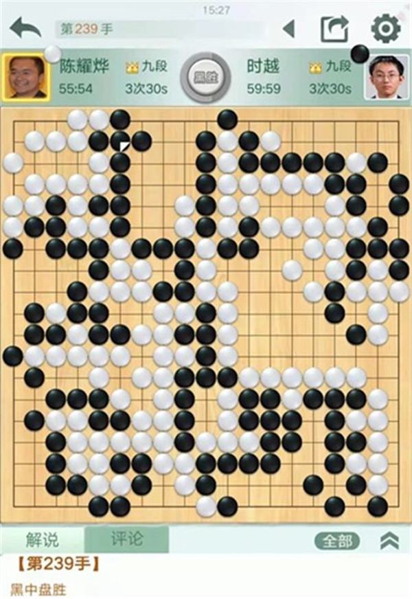 時越快棋執(zhí)黑對陣世界冠軍陳耀燁。中盤黑棋在右邊白勢中試應手,白棋應對松緩,被黑棋先手便宜十幾目棋,黑局面領(lǐng)先。之后黑棋行棋嚴謹,中盤獲勝。
