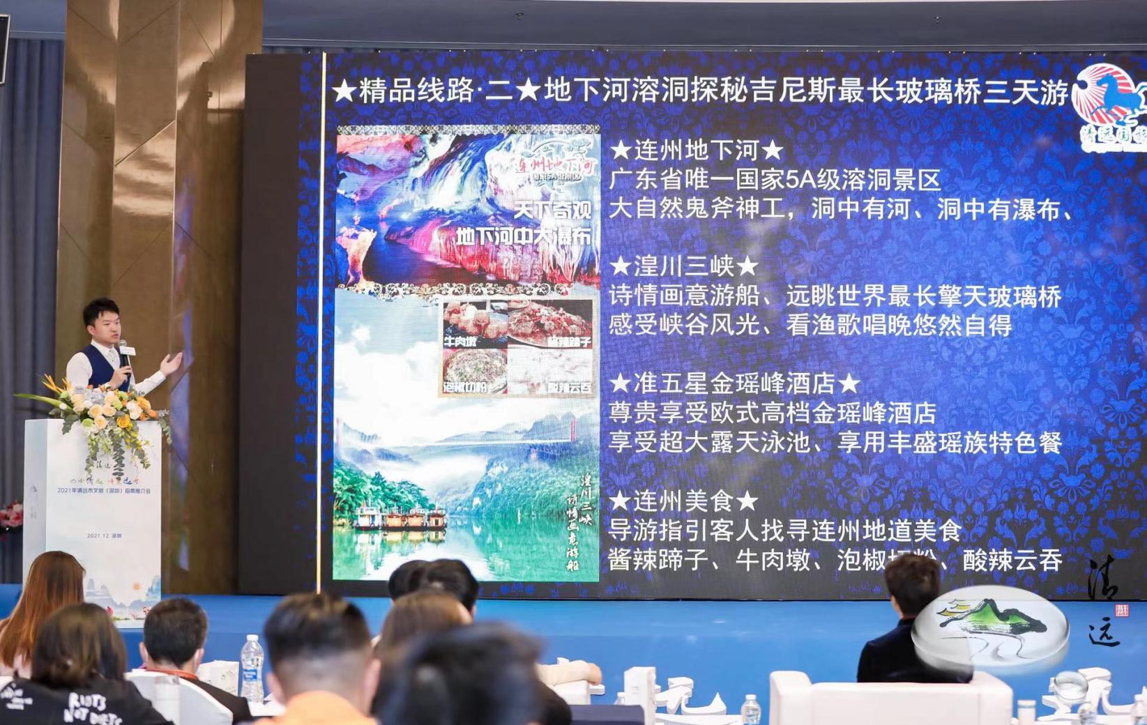 文化是旅游的靈魂,旅游是文化的載體。近年來,清遠(yuǎn)依托自然資源稟賦和深厚的文化底蘊(yùn),多措并舉推動(dòng)文旅融合發(fā)展,文旅產(chǎn)業(yè)呈現(xiàn)欣欣向榮局面?,F(xiàn)場,清遠(yuǎn)市珠水美悅酒店管理有限公司總經(jīng)理宋玉亮、清遠(yuǎn)市古龍峽生態(tài)旅游娛樂有限公司營銷專員林嘉儀、清遠(yuǎn)市愛地旅游發(fā)展有限公司營銷經(jīng)理?xiàng)钍婧?、清遠(yuǎn)市國業(yè)旅游開發(fā)有限公司常務(wù)副總經(jīng)理韓勇,依次以圖文并茂、聲畫結(jié)合的形式,推介了美林湖景區(qū),古龍峽景區(qū),連州地下河、湟川三峽、龍?zhí)犊蜅?、擎天玻璃橋、連州大酒店,峰林曉鎮(zhèn)、洞天仙境,讓與會(huì)人員身臨其境感受山水清遠(yuǎn)的魅力;清遠(yuǎn)市國旅國際旅行社有限責(zé)任公司業(yè)務(wù)總監(jiān)李國華則現(xiàn)場推介了古龍峽云天玻霸兩天游、地下河溶洞探秘及吉尼斯最長玻璃橋三天游等5條精品旅游線路,現(xiàn)場“種草”清遠(yuǎn)眾多網(wǎng)紅打卡點(diǎn)。