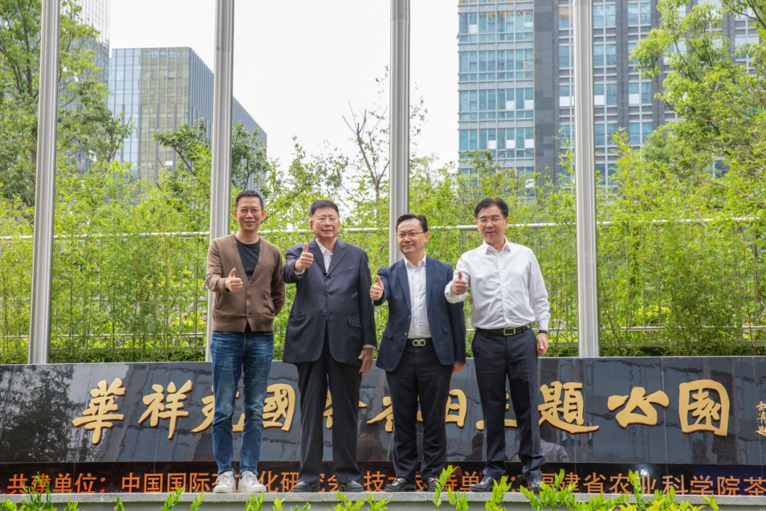 全國(guó)人大常委會(huì)原委員、福建省人大常委會(huì)原副主任、海峽兩岸茶業(yè)交流協(xié)會(huì)高級(jí)顧問莊先(左二),中國(guó)工程院院士、湖南農(nóng)業(yè)大學(xué)學(xué)術(shù)委員會(huì)主任劉仲華(右二),著名財(cái)經(jīng)作家、華祥苑國(guó)貨推薦官吳曉波(左一),華祥苑茶業(yè)股份有限公司董事長(zhǎng)肖文華(右一)共同為主題公園開園揭幕。為慶賀國(guó)際茶日而建的主題公園——521國(guó)際茶日主題公園,盛大開園!世界茶樹在這里匯聚,華祥苑八大莊園的茶樹于此展現(xiàn),學(xué)習(xí)堂里有對(duì)中國(guó)茶發(fā)展的殷殷囑托。中國(guó)茶文化的世界坐標(biāo),中國(guó)傳統(tǒng)文化的世界表達(dá),再添新章。